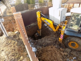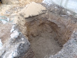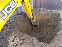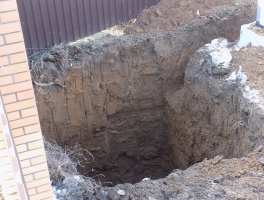 Так как разрабатывать котлован для установки септика пришлось практически впритык к забору, он получился неправильной формы. Несмотря на сложность уже к 11 часам был полностью готов котлован шириной 2,70 и глубиной 3,50 метра, но дальнейшие работы пришлось приостановить, так как не был подвезен песок, этапы установки септика были нарушены. Песок доставили на объект только к 17 часам. По договору доставка необходимых материалов не входила в компетенцию монтажной бригады.
