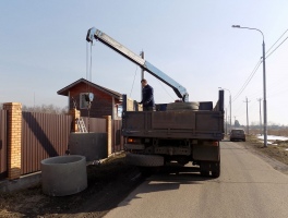 Водоотведение из септика спланировано самотеком в канализационную насосную станцию из бетонных колец, а оттуда принудительно в ливневую дренажную канаву на противоположной стороне дороги. Для того чтобы не терять время, приступили к монтажу КНС. Установка выполнялась за пределами участка, за забором. На объект кольца подвезли в 11:20 прямо с завода, очень прочные и тяжелые.