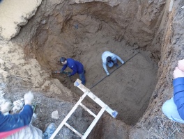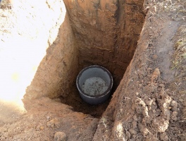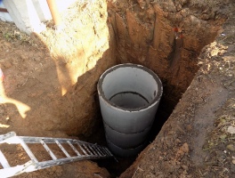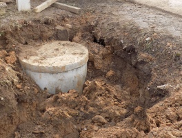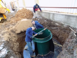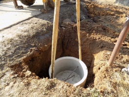 В 13:30 был полностью выкопан котлован. КНС монтировали из четырех бетонных колец, нижнее кольцо герметичное, т.е. с дном. Для предотвращения попадания грунтовой воды внутрь КНС кольца сажались на раствор. Их аккуратно опускали экскаватором в котлован и сажали встык поочередно.