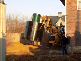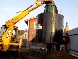Монтируемая станция — самотечная, это значит, что высота между подводящей и отводящей трубой отличаются примерно на 10см. Для правильной установки ее необходимо было повернуть. Обычно делается это следующим образом. ЛОС опускается в котлован и проворачивается до тех пор, пока она не встанет в нужном положении. На этом объекте прокрутить станцию в котловане было невозможно из-за обваливающихся стенок. Станцию пришлось поднять еще раз. В 17:55, после непродолжительных манипуляций на весу, ЛОС была полностью установлена.
