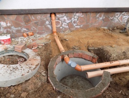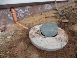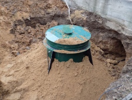 Сначала завели подводящую трубу. Под трубой сделали песчаную подушку: возле станции — 10см, у ревизионного колодца, который был поставлен у дома в первый день работы — 20см. Особенности объекта сделали невозможным завод трубопровода в дом под землей. Поэтому алмазное бурение фундамента не потребовалось. По желанию клиента сделали прокол перфоратором, так как в доме сделана разводка по уровню пола, а не в подвале.