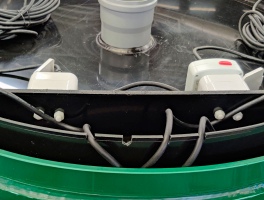Размещение розеток электропитания внутри очистного сооружения в герметичном модуле, вставляемом в горловину. От точки подключения к электрической сети до розеток питания в модуле достаточно проложить всего один электрический кабель.